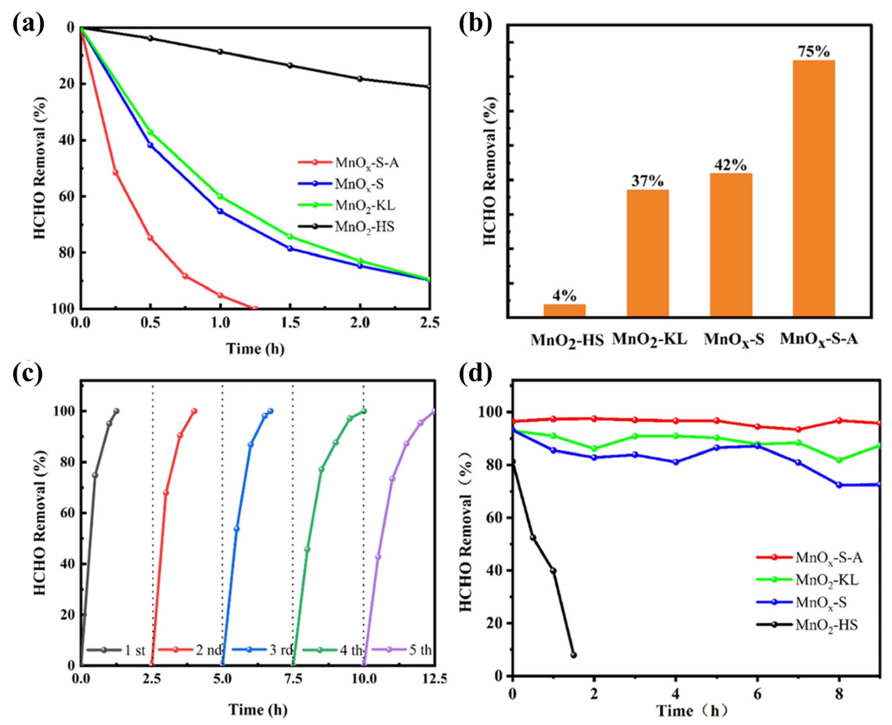 He et al. [95] conducted a systematic study on how to achieve efficient adsorption and catalytic oxidation of formaldehyde at room temperature by regulating the specific surface area and surface-active oxygen content of MnOx. As shown in Figure 17a,c, MnOx-S-A completely removes HCHO (~1 ppm) within 1.25 h, and after 5 cycles, it still maintains a 100% removal rate. Figure 7b shows that the adsorption capacity of MnOx-S-A is as high as 75% in the initial 0.5 h, which is much better than other samples. In addition, Figure 17d underwent dynamic testing, the result shows that MnOx-S-A maintains a removal rate of >95% for 9 consecutive hours under GHSV = 150 L/(g · h) and ~1 ppm HCHO; In contrast, the activity of other catalysts rapidly decreases. In this article, it is proposed to induce the oxidation-reduction cycle of Mn3+/Mn2+ through acid treatment, simultaneously enhancing the density of oxygen vacancies, surface reactive oxygen species, and the stability of the mesoporous structure. As shown in Figure 16, MnOx-S-A performed the best under all test conditions, featuring high activity at room temperature, high stability, and high adsorption capacity. MnOx-S-A is a type of high specific surface area manganese oxide that regulates oxygen vacancies and reactive oxygen content through acid treatment. It possesses extremely strong adsorption capacity, room-temperature catalytic activity, and long-term stability, and has the potential for large-scale application in air purifiers, household filters, and vehicle deodorization modules. These three catalysts are all based on MnO2-KL and synthesized using different ratios and hydrothermal temperatures.