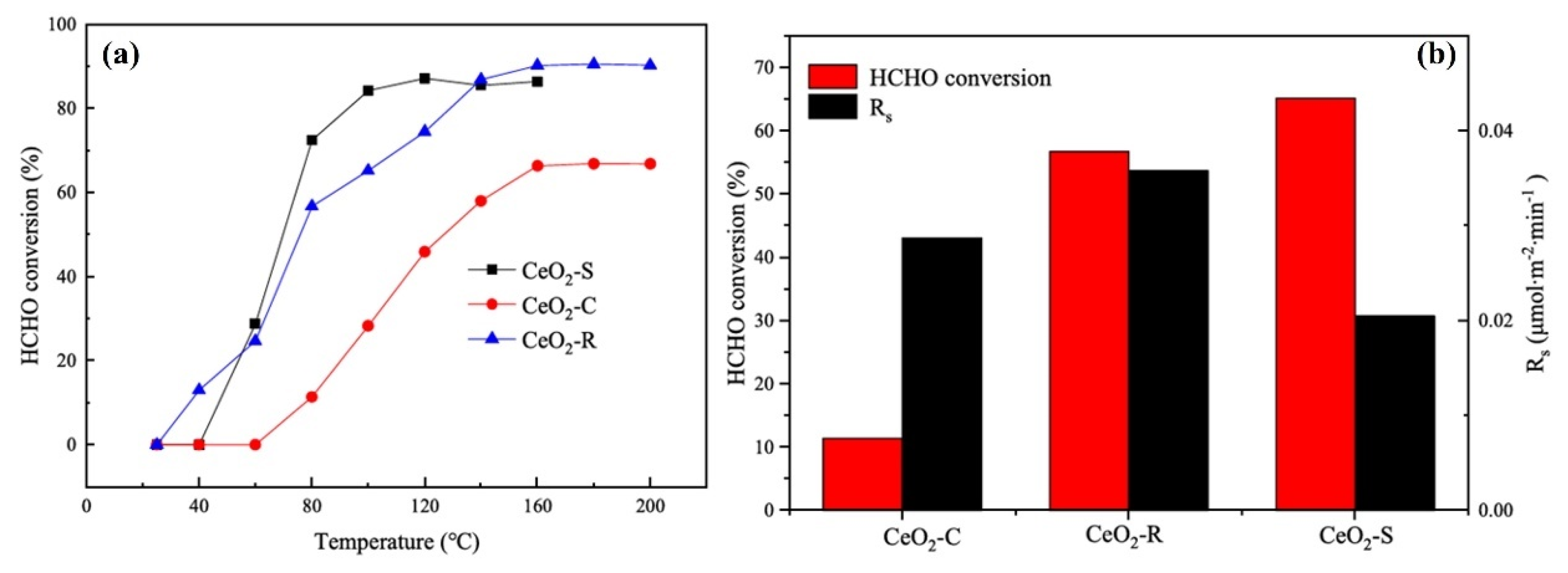 The catalysts prepared by different methods have different morphologies (exposing different crystal planes), and therefore have different catalytic activities. In the oxidation of formaldehyde, the catalytic activity is the combined effect of multiple physical and chemical properties of the catalyst, such as surface oxygen vacancies and specific surface area.