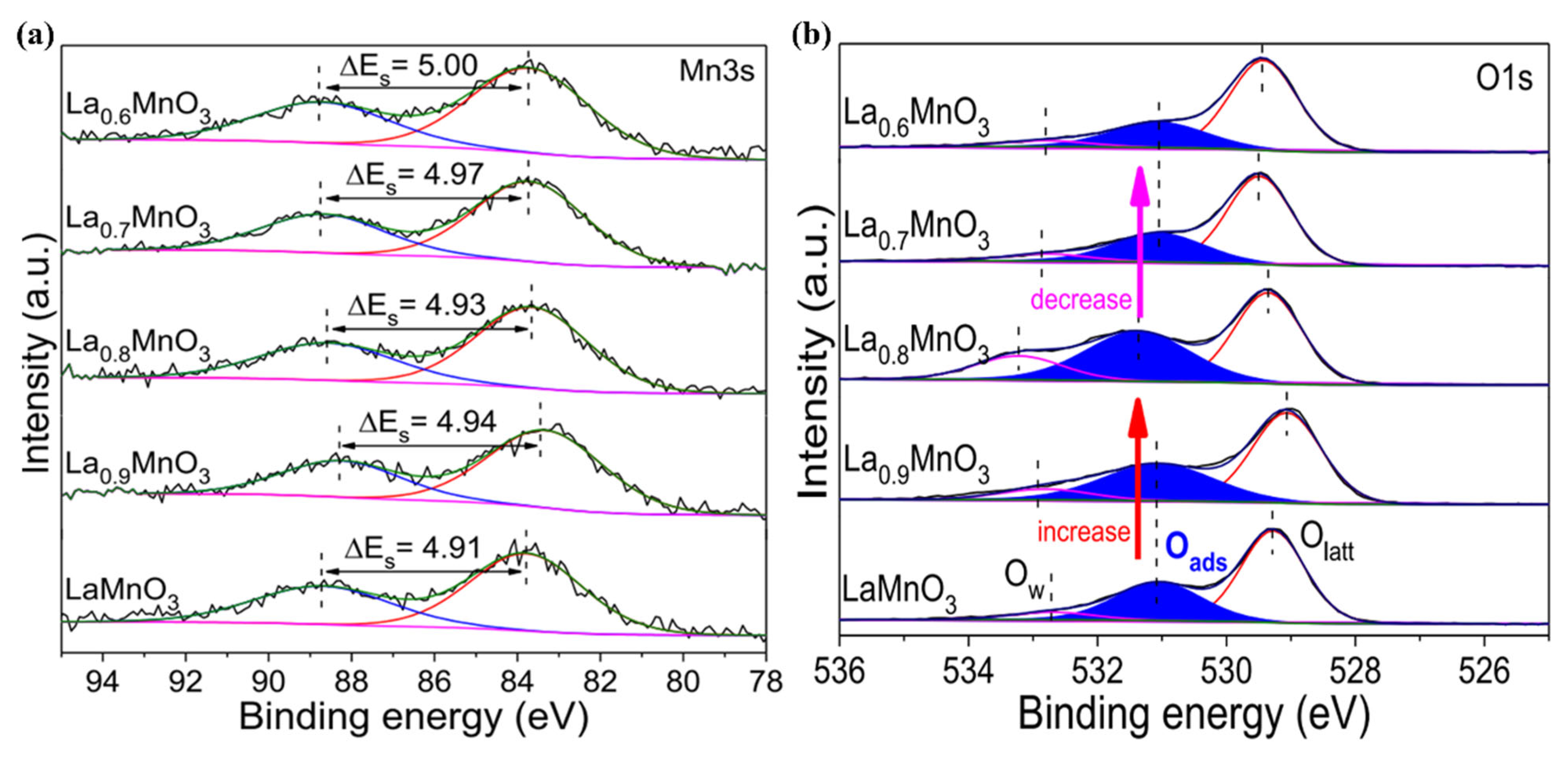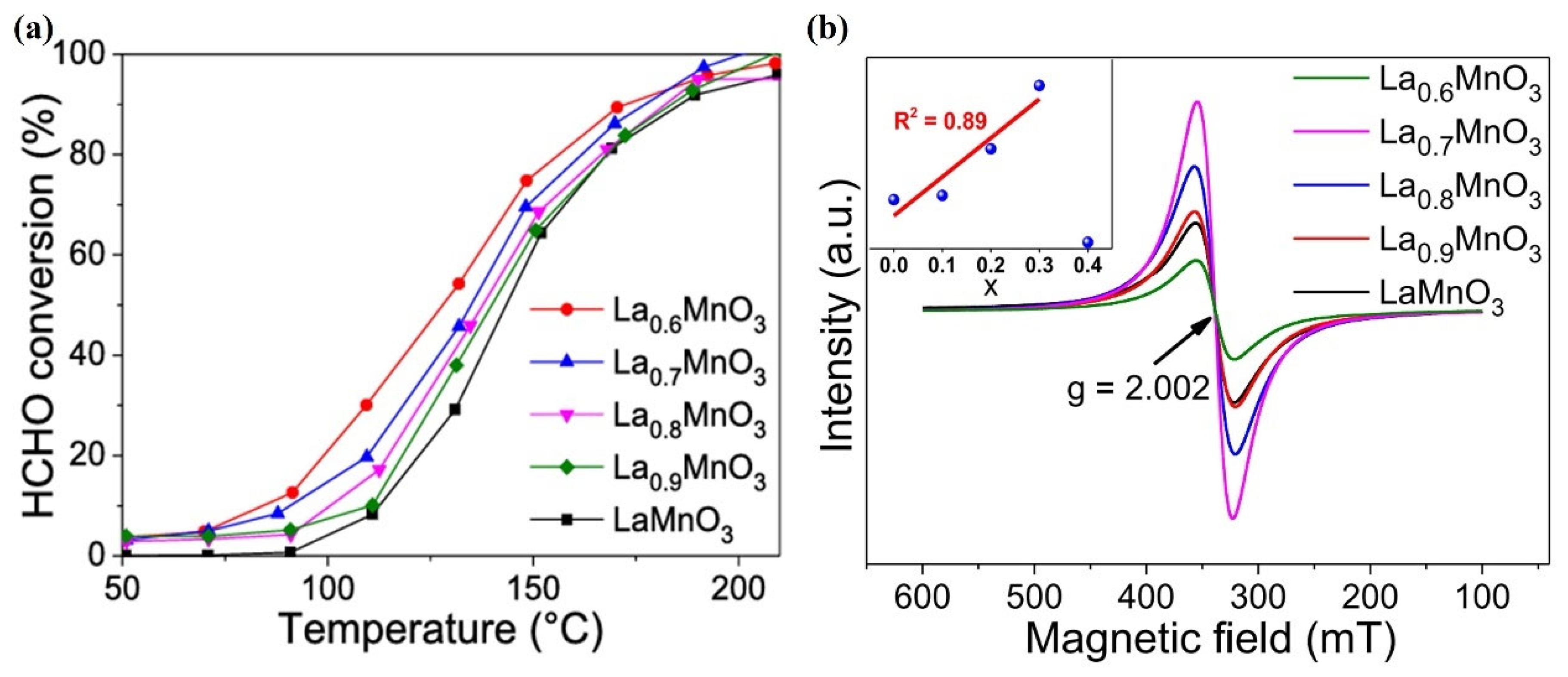 The composite metal oxide outperforms the single metal oxide in terms of three key indicators: low-temperature activity, long-term stability, and resistance to water poisoning. It is the preferred solution for catalytic oxidation of formaldehyde at room temperature. Xu et al. [109] synthesized a series of La1-xMnO3 (x = 0–0.4) perovskites via the sol-gel method, introducing A-site cation vacancies (VLa) by adjusting the La/Mn ratio. In Figure 20 and Figure 21, EPR spectra and XPS spectra confirmed that the concentration of defect-induced oxygen vacancies (VO) increases linearly with the increase of La defects (reaching a peak at x = 0.3), but excessive defects (x = 0.4) lead to structural collapse and phase separation of Mn3O4. This study elucidates that A-site cation defects synergistically enhance the low-temperature oxidation activity of La1-xMnO3 perovskite towards HCHO by regulating the concentration of oxygen vacancies, electronic structure, and surface-active oxygen species, providing a new paradigm of defect engineering for the design of low-cost and high-efficiency air purification catalysts. Future efforts are needed to further optimize the low-temperature activity (<100 °C) and large-scale preparation process.