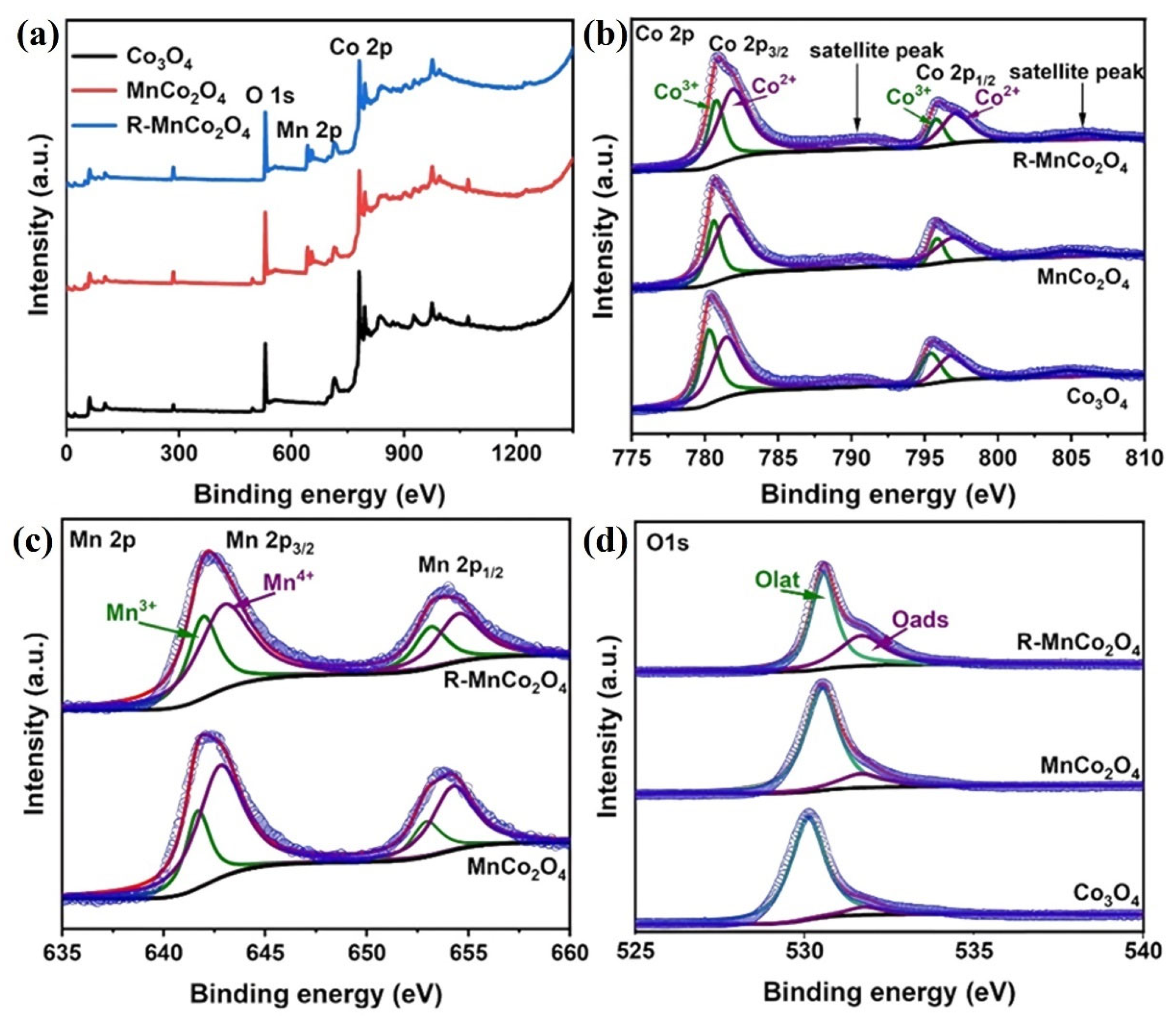 Yan et al. [110] adopted a three-step method involving co-precipitation, calcination, and NaBH4 reduction to construct Mn-doped cobalt oxide (R-MnxCo3−xO4). Figure 22 shows that Mn ions entered the Co3O4 lattice to replace Co sites, inducing lattice distortion. Figure 23 confirmed that Mn doping reduction increased the Vo concentration to 5.77% (atomic ratio) and the proportion of surface adsorbed oxygen (Oads) to 42.2% (compared to only 15.1% in Co3O4). This study elucidated the intrinsic correlation between oxygen vacancy concentration, electronic structure, and catalytic activity, proposing a synergistic strategy of “atomic doping reduction defect engineering”. This provides a universal design approach for developing non-precious metal, low-cost, high-stability catalysts for low-temperature HCHO purification, combining theoretical value with industrialization potential.