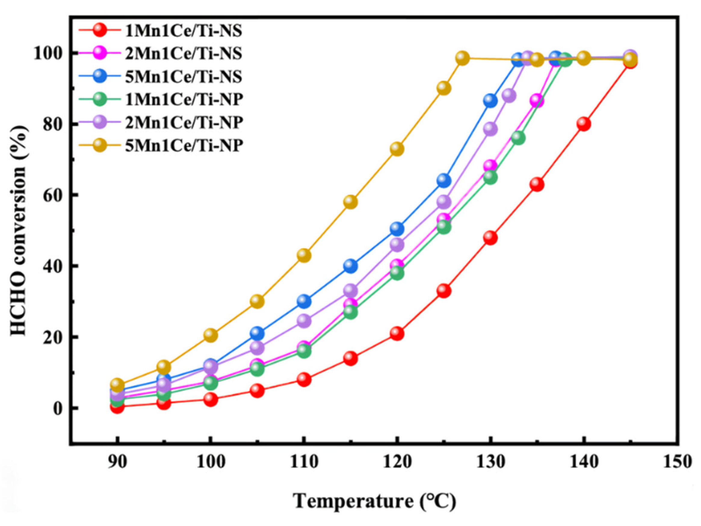 Figure 25. Catalytic activity tests for 1Mn1Ce/Ti-NS, 2Mn1Ce/Ti-NS, 5Mn1Ce/Ti-NS, 1Mn1Ce/Ti-NP, 2Mn1Ce/Ti-NP, and 5Mn1Ce/Ti-NP. This figure has been adapted from a previous reference [112].
