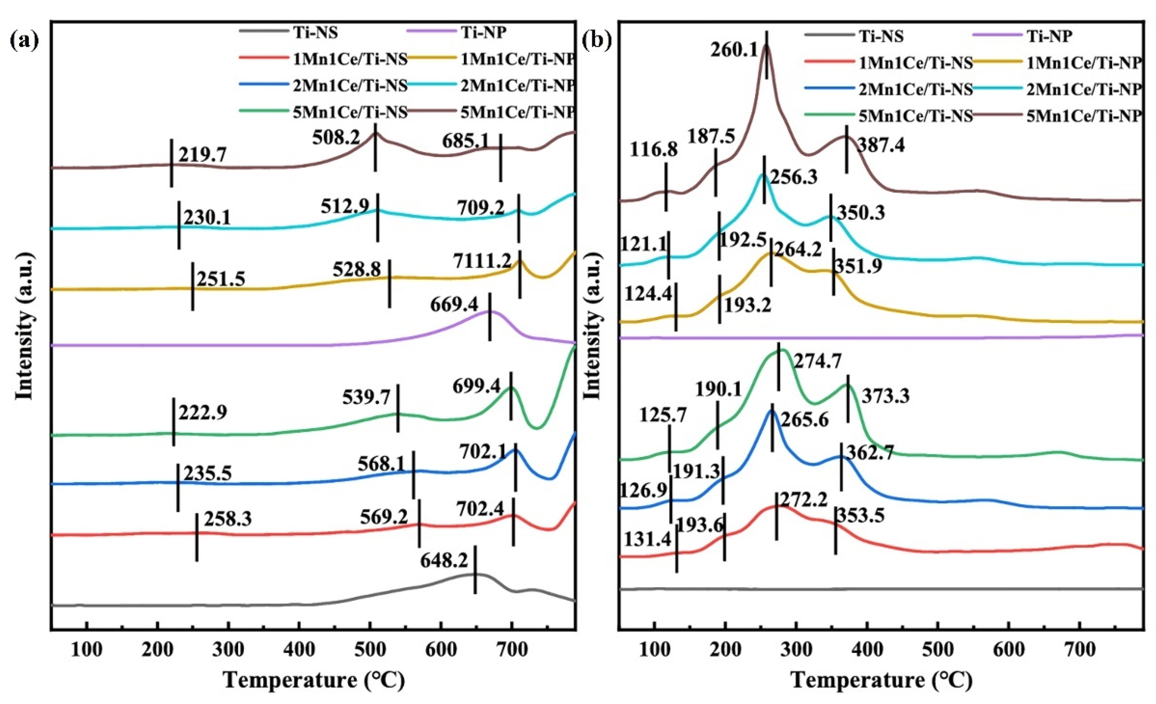 Figure 26. (a) O2-TPD and (b) H2-TPR curves for Ti-NS, 1Mn1Ce/Ti-NS, 2Mn1Ce/Ti-NS, 5Mn1Ce/Ti-NS, Ti-NP, 1Mn1Ce/Ti-NP, 2Mn1Ce/Ti-NP, and 5Mn1Ce/Ti-NP. This figure has been adapted from a previous reference [112].