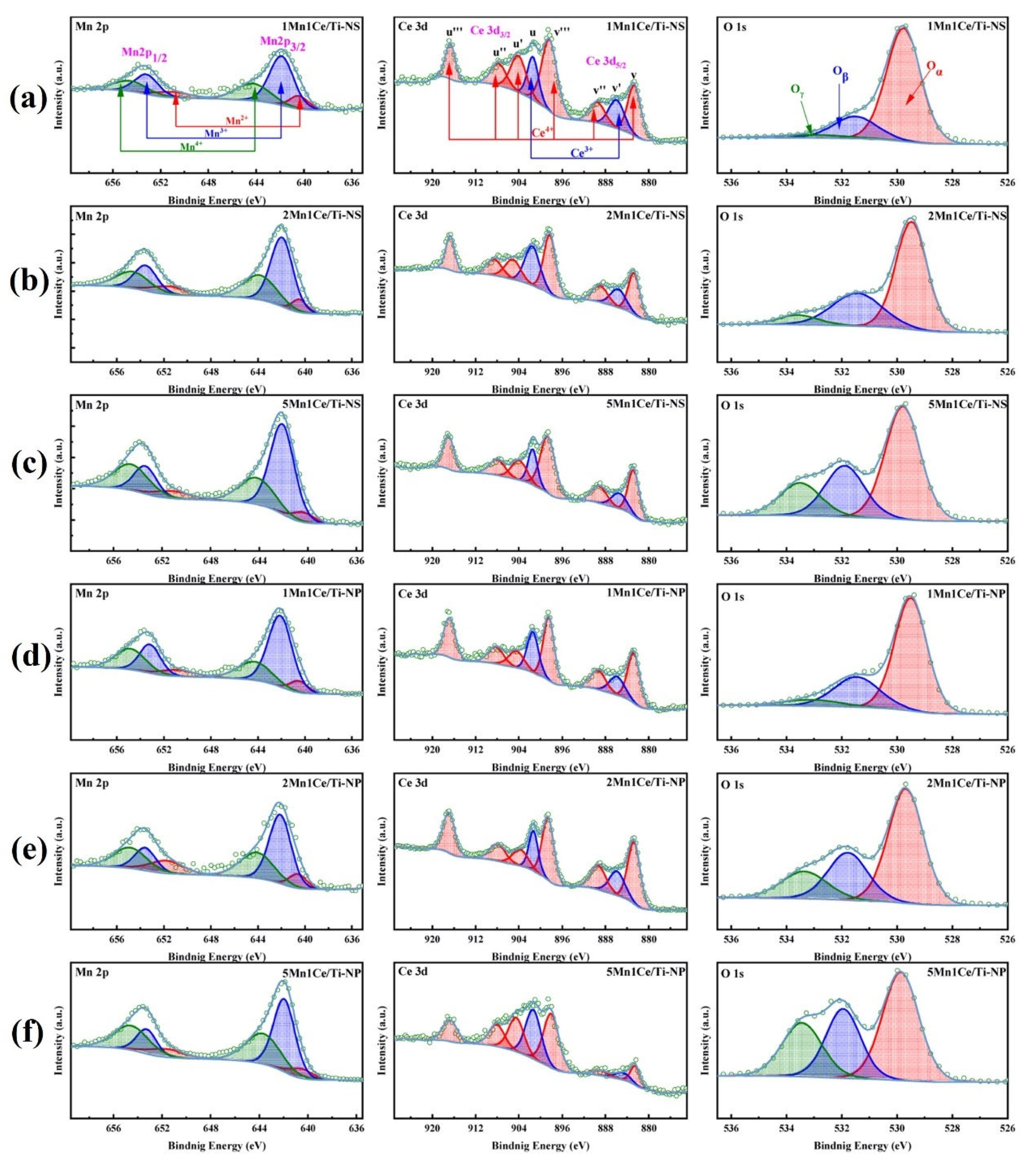 Figure 27. (af) Ce 3d, Mn 2p and O 1 s spectra of 1Mn1Ce/Ti-NS, 2Mn1Ce/Ti-NS, 5Mn1Ce/Ti-NS and 1Mn1Ce/Ti-NP, 2Mn1Ce/Ti-NP, 5Mn1Ce/Ti-NP. This figure has been adapted from a previous reference [112].