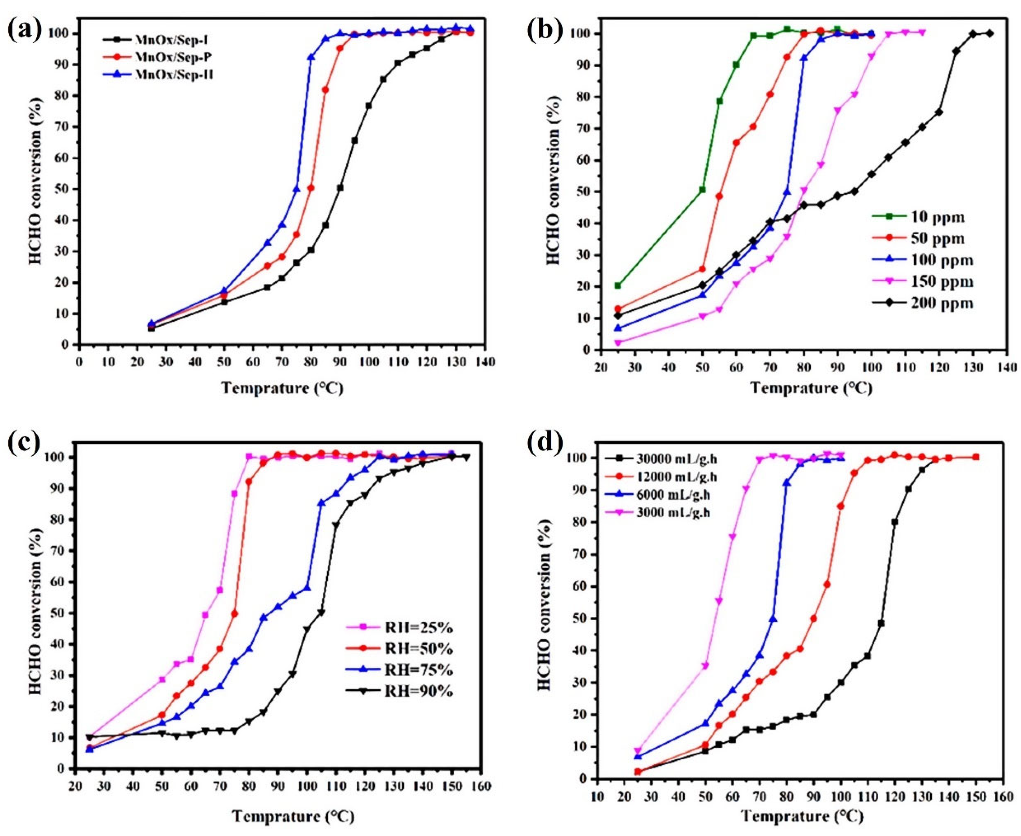 Figure 28. The performance of the catalytic oxidation of HCHO. (a) The catalytic activity of MnOX/Sep-H, MnOX/Sep-P, and MnOX/Sep-I; (b) Effects of different HCHO concentrations on catalytic oxidation of HCHO over MnOX/Sep-H; (c) Effects of different reaction humidity on catalytic oxidation of HCHO over MnOX/Sep-H; (d) Effects of different GHSV on MnOX/Sep-H catalyst activity. This figure has been adapted from a previous reference [101].