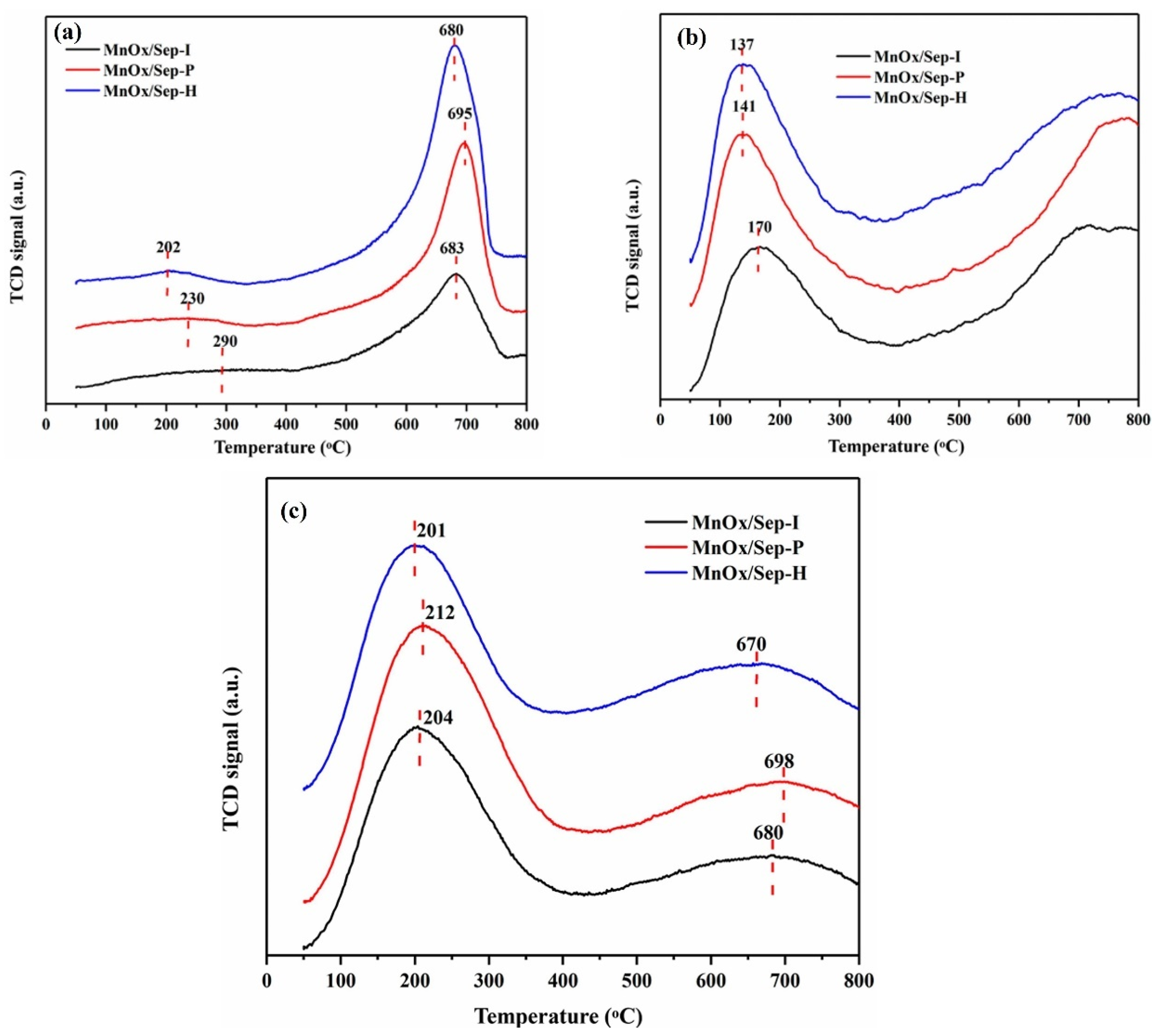 Figure 29. (a) The H2-TPR, (b) O2-TPD profiles, and (c) CO2-TPD profiles of MnOX/Sep-H, MnOX/Sep-P, and MnOX/Sep-I. This figure has been adapted from a previous reference [101].