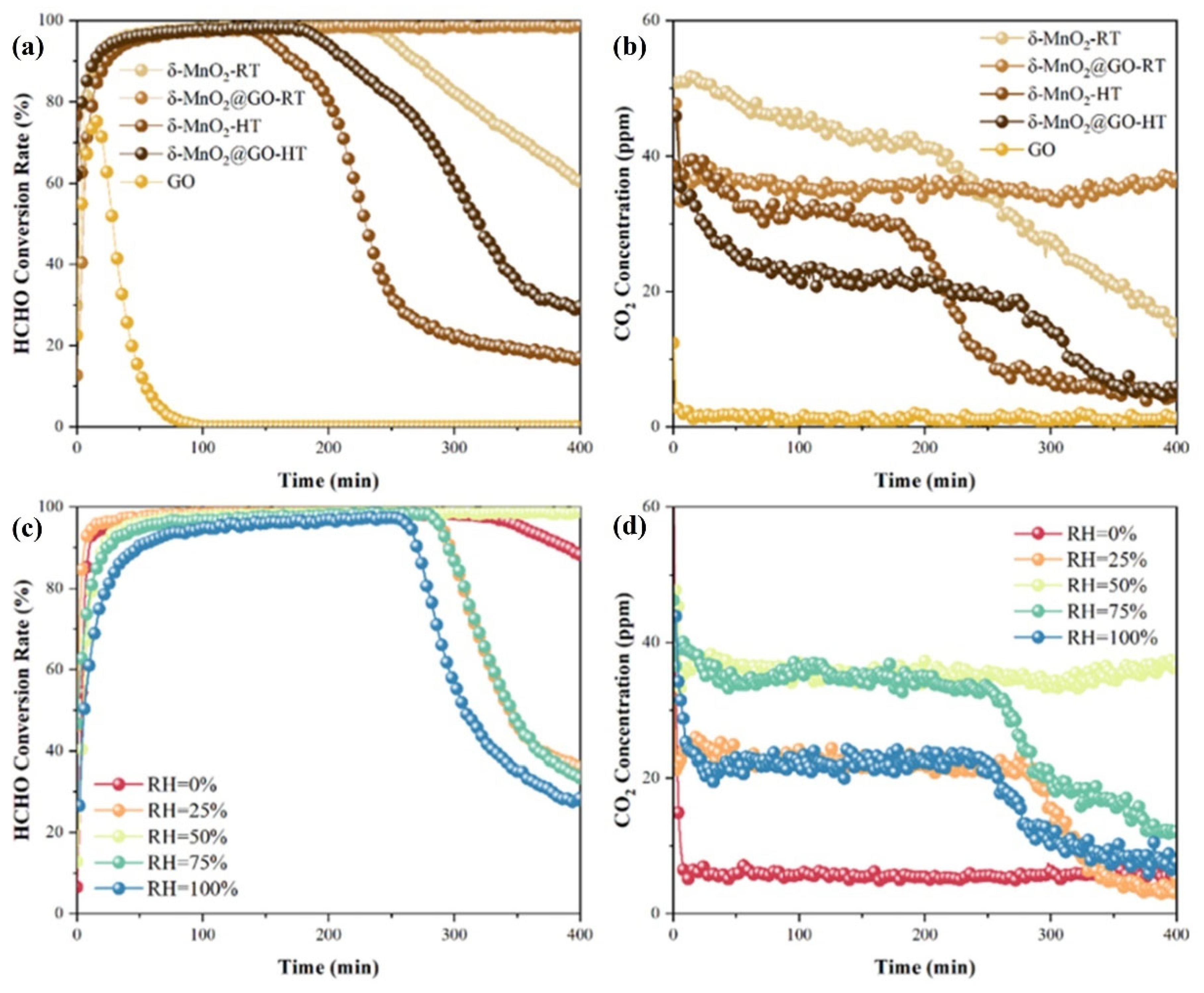 Figure 31. (a) HCHO removal efficiency and (b) corresponding CO2 concentration as a function of time over δ-MnO2 and δ-MnO2@GO samples (HCHO concentration = 100 ppm, air as balance gas, temperature ~ 25 °C, RH =50%, GHSV =72 L/g·h); (c) HCHO removal efficiency and (d) corresponding CO2 concentration as a function of time over δ-MnO2@GO-RT at different relative humidity. (RH =0%, 25%, 50%, 75%, and 100%). This figure has been adapted from a previous reference [102].