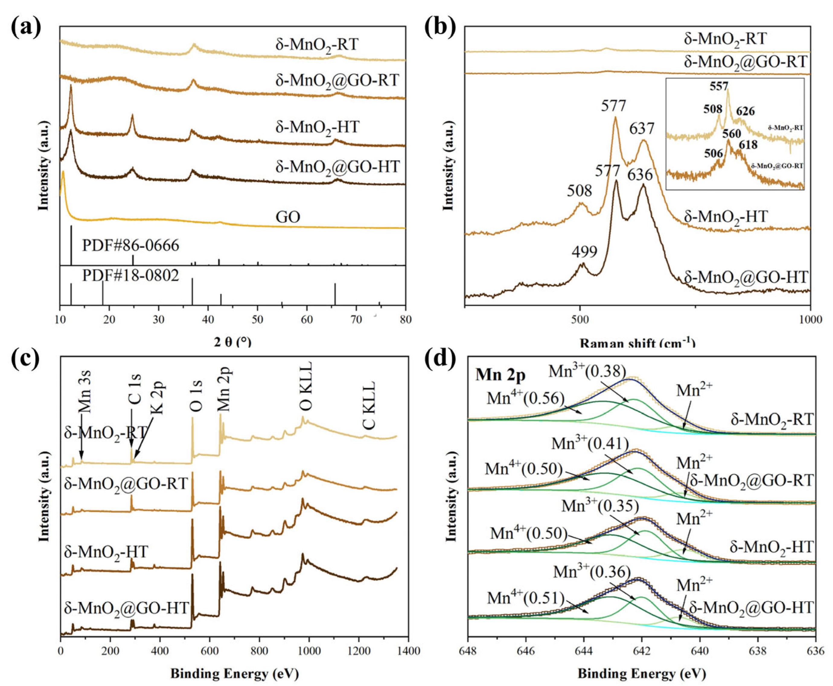 Figure 32. (a) XRD patterns of various δ-MnO2 and GO samples, (b) Raman spectra of various δ-MnO2 samples from 200 to 1000 cm−1 (the inset displays the magnified Raman spectra of δ-MnO2-RT and δ-MnO2@GO-RT), and XPS spectra of various δ-MnO2 samples: (c) survey spectrum and (d) Mn 2p spectrum. This figure has been adapted from a previous reference [102].