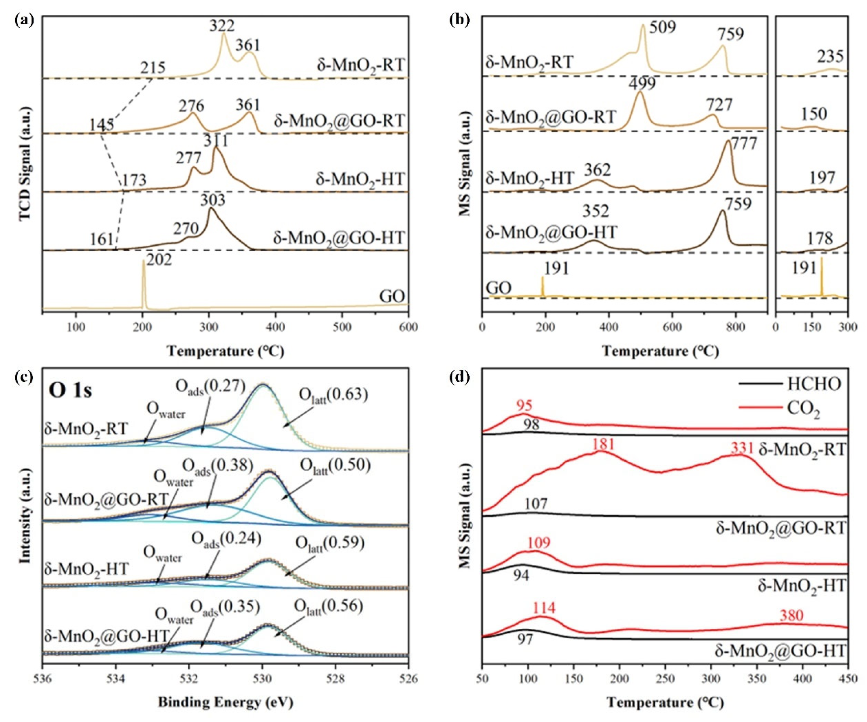 Figure 33. (a) H2-TPR spectra, (b) O2-TPD-MS spectra of various δ-MnO2 and GO samples, (c) O 1s spectra, and (d) HCHO-TPD-MS spectra of various δ-MnO2 samples. This figure has been adapted from a previous reference [102].