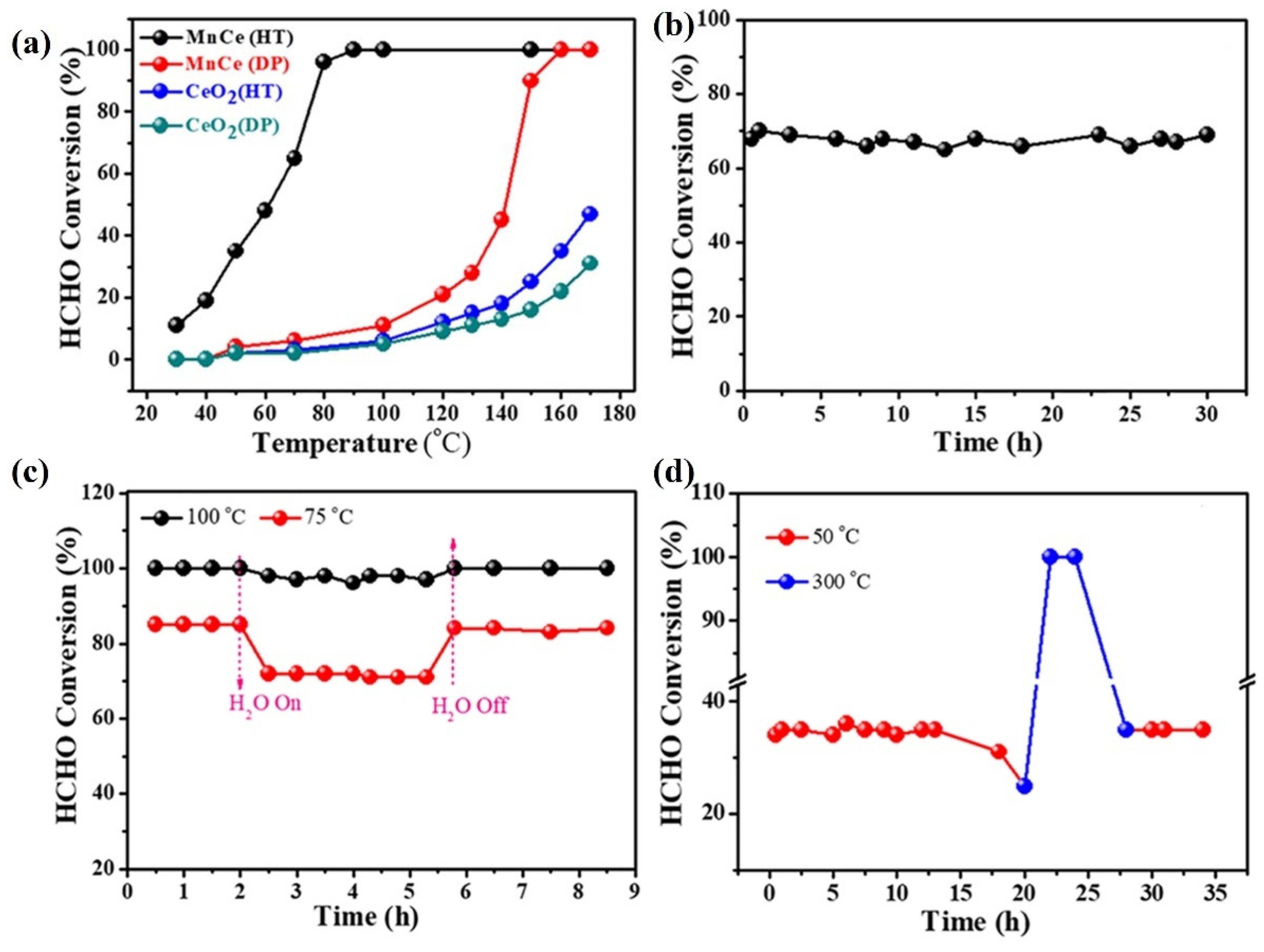 Figure 34. (a) HCHO oxidation activities of MnCe (HT), MnCe (DP), and reference CeO2 catalysts. (b) Stability of MnCe (HT) catalyst under HCHO oxidation conditions at 75 °C. (c) Effect of 5% of moisture on the catalytic activity. (d) Regeneration of MnCe (HT) catalyst. This figure has been adapted from a previous reference [113].