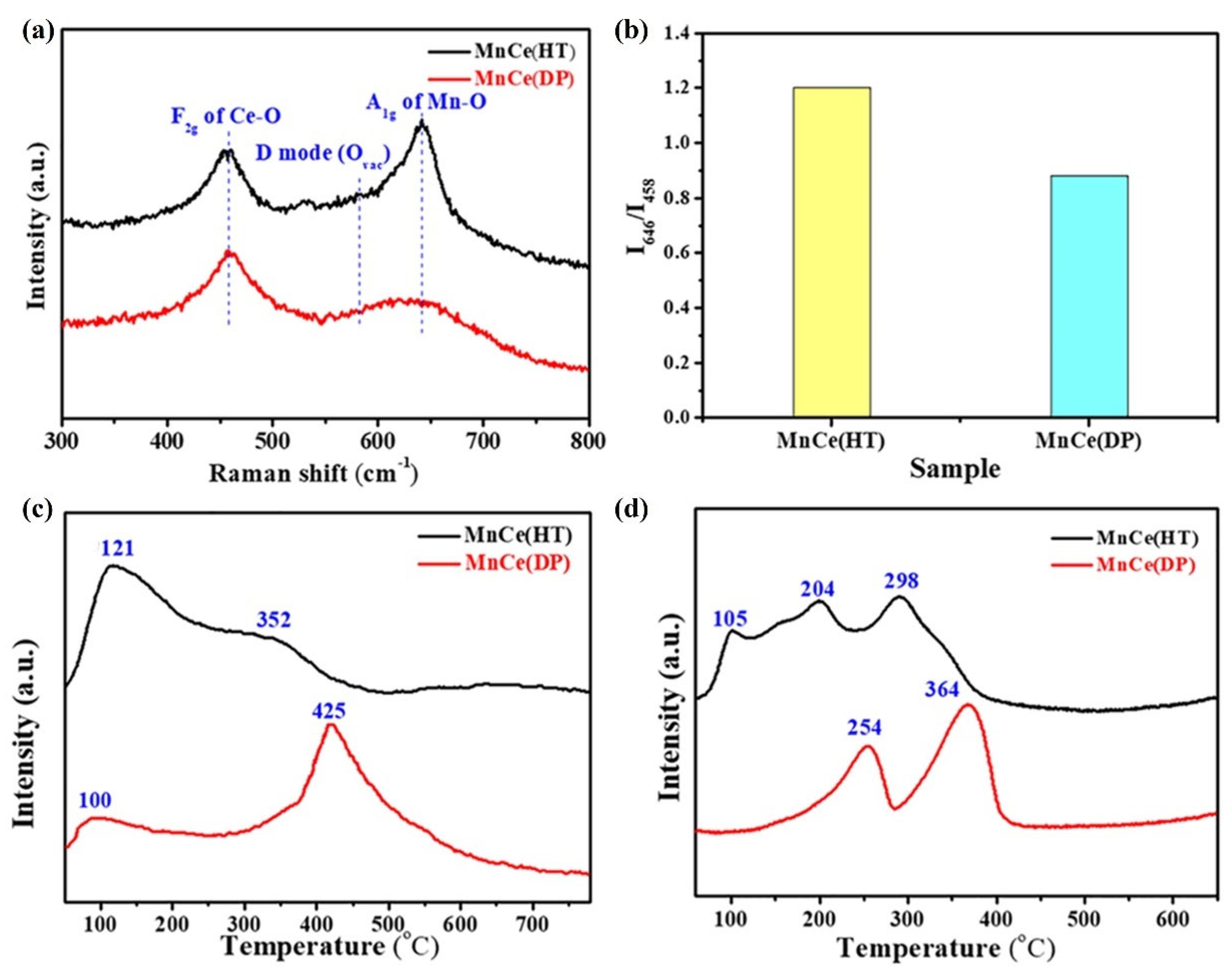 Figure 35. (a) Raman spectra, (b) Raman peak intensity ratio of 646 cm−1 and 458 cm−1 (I646/I458), (c) O2-TPD profiles of MnCe (HT) and MnCe (DP), and (d) H2-TPR profiles of MnCe (HT) and MnCe (DP). This figure has been adapted from a previous reference [113].