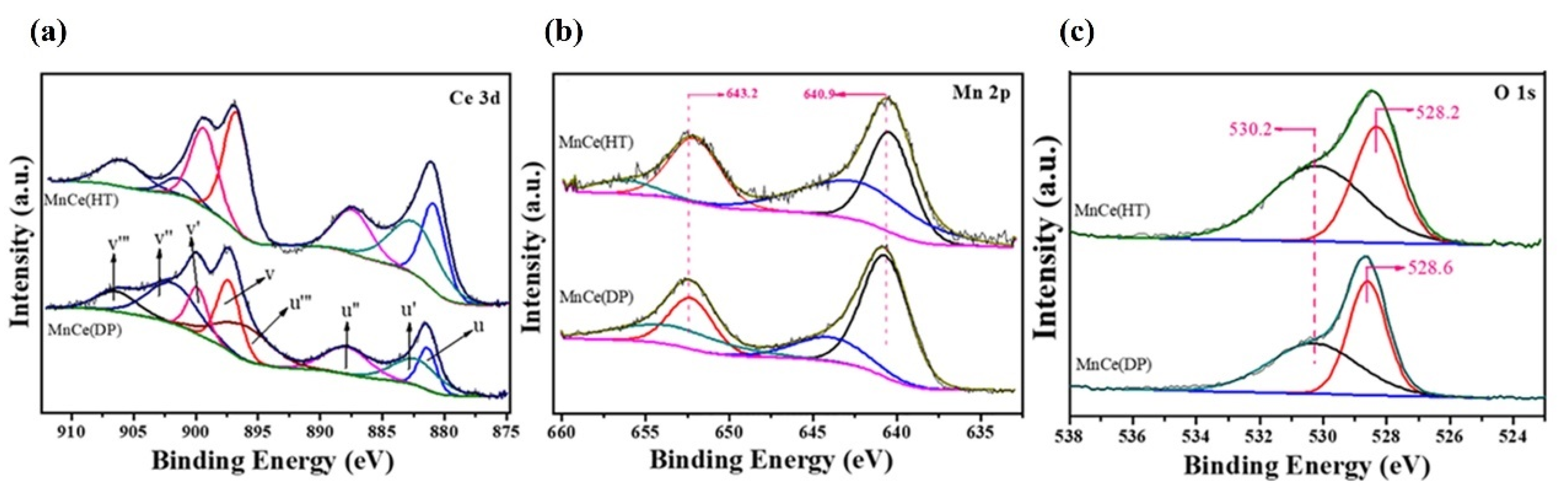 Figure 36. (a) Ce 3d, (b) Mn 2p (c) and O 1 s XPS spectra of MnCe (HT) and MnCe (DP) catalysts. This figure has been adapted from a previous reference [113].