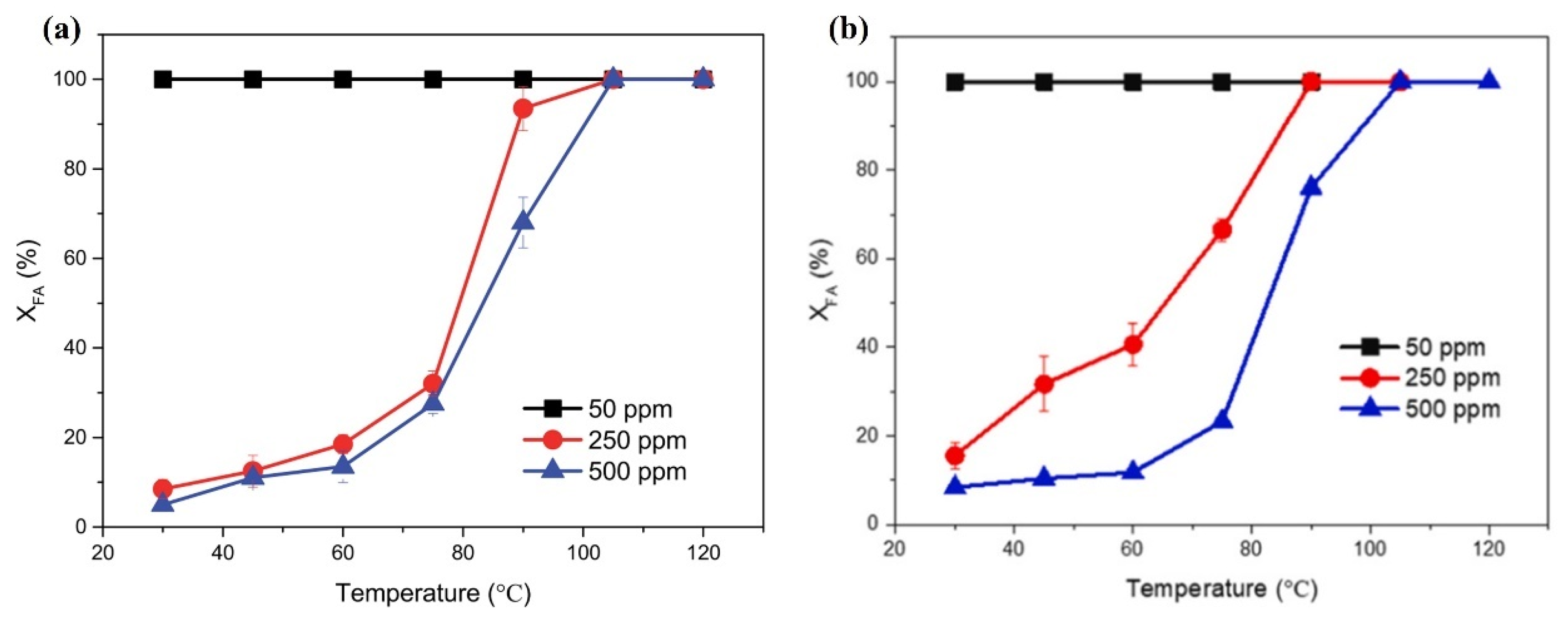 In real indoor air scenarios, the HCHO concentration often fluctuates dramatically within the range of several tens to several hundred parts per million (ppm), depending on the season, ventilation mode, and the intensity of pollution sources. This poses an extensive concentration window adaptability requirement for catalytic oxidation systems. Hua [96] studied the effect of different initial HCHO concentrations (50, 250, 500 ppm) on 1-MnCo2O4 catalyst activity. Figure 39a shows that the HCHO is completely converted at 30 °C,90 °C, and 100 °C for 50, 250, and 500 ppm, respectively. Analogously, Hua [97] studied the effect of different initial HCHO concentrations (50, 250, 500 ppm) on 1-CuMn2O4 catalyst activity (Figure 39b), the HCHO complete conversion at 30 °C, 100°C, and 100 °C for 50, 250, 500 ppm, respectively. In conclusion, the conversion rate of formaldehyde decreases as the initial concentration of formaldehyde increases.