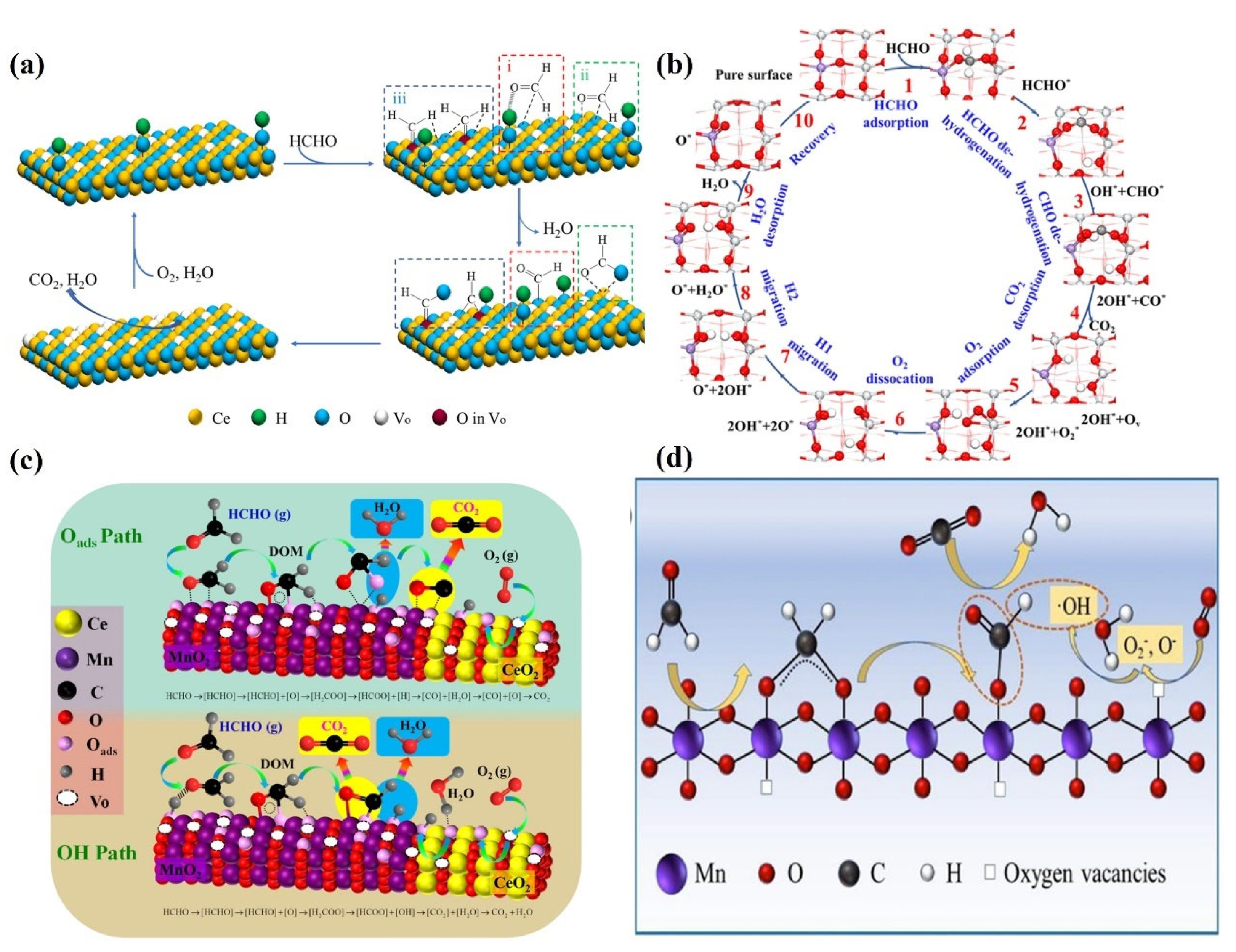 For the mechanism study of the HCHO catalytic oxidation process, the first step of the entire catalytic oxidation process is adsorption. This step is in line with the three classic adsorption models (MVK, L-H, E-R). In this paper, we propose a summary that in the presence of water, surface active oxygen species can generate hydroxyl groups. The formaldehyde molecule is adsorbed by hydrogen bonds with surface hydroxyl groups. When there is strong metal interaction, it may adsorb on oxygen vacancies or the bridging points of certain material surface atoms. The entire mechanism process can be summarized as follows: Formaldehyde adsorption, formaldehyde reacts with reactive oxygen species to form DOM, which is then oxidized into formate species. Finally, it may directly generate carbon dioxide and water, or it may first generate carbon monoxide and then be oxidized to indirectly generate carbon dioxide.