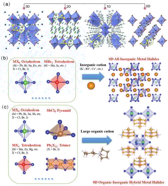 The dimensionality of OIMHs is defined by the arrangement and connectivity of inorganic polyhedra within the crystal lattice. Depending on the connectivity of metal–halide octahedra, OIMHs can adopt different dimensional structures. When the organic cations are relatively small, the inorganic octahedra extend continuously via metal–halide coordination bonds to form three-dimensional (3D) networks. In contrast, introducing bulky organic cations disrupts the octahedral network, reducing the structural dimensionality and yielding two-dimensional (2D) layered, one-dimensional (1D) chain-like, or zero-dimensional (0D) cluster-like OIMHs, collectively referred to as OIMHs (Figure 1a) []. Low-dimensional OIMHs exhibit higher exciton binding energies and therefore superior emissive properties and radiative recombination characteristics [,,,,]. At the same time, low-dimensional OIMHs offer enhanced stability and reduced toxicity, making them attractive replacements for 3D Pb-based OIMHs; they display excellent optical performance and have achieved notable progress across optoelectronic applications. Consequently, the rational design and synthesis of functional OIMHs are of substantial research significance for enabling diverse practical uses [,,,]. Nevertheless, challenges persist in the structural design and mechanistic understanding of low-dimensional OIMHs. Issues such as limited stability and luminescence efficiency loss remain to be addressed. Against this backdrop of opportunities and challenges, a systematic review is essential for advancing the understanding and future development of OIMHs.