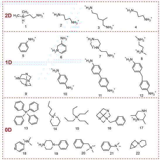 OIMHs are composed of metal–halide anions and organic cations. In terms of composition, the selection of the metal cation plays a pivotal role in shaping the properties of OHMHs. The chemistry of the ns2 ion (Pb2+, Bi3+, Sn2+, Sb3+, etc.) is closely related to the electronic properties and dielectric properties of ns2 cation-based OIMHs. Moreover, the organic unit in OIMHs is typically an ammonium species or a sulfur-/phosphorus-containing cation. The structural diversity of OIMHs is governed primarily by the types of organic cations present and by the spatial packing of the inorganic polyhedral framework units [,,,]. During formation, multiple intermolecular forces drive the orderly assembly of the organic and inorganic parts: organic cations attract each other through van der Waals interactions and hydrogen bonding, whereas the inorganic units connect via corner-, edge-, or face-sharing coordination. Strong hydrogen bonding between the organic cations and the inorganic polyhedra further ensures a highly ordered structure, endowing OIMHs with excellent optoelectronic properties [,,,]. Figure 2 displays some typical organic cations in the reported 2D, 1D, and 0D OIMHs [].