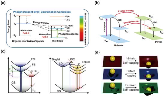 Because STE emission originates from excited-state lattice distortions, it is sometimes described as a defect of the excited state, as shown in Figure 3d. Unlike defect-induced luminescence, which depends on intrinsic defect density, STE emission arises from a perfect ground-state lattice with only transient excited-state perturbations. Moreover, extrinsic STEs can form when dopant ions introduce local inhomogeneity. In both intrinsic and extrinsic cases, distributions of self-trapping depths promote broadband emission [,]. While STE-based luminescence offers unique advantages for OIMHs, limitations such as restricted spectral tunability and thermal quenching motivate exploration of alternative or hybrid emission pathways [].