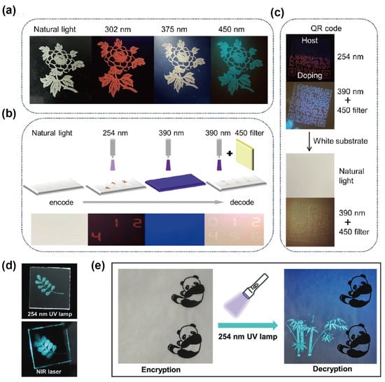 Information recording, storage, and security technologies represent a cornerstone of modern information systems, with vital applications spanning national defense, financial protection, and daily life []. Among these, information encryption ensures confidentiality, integrity, and authenticity, thereby preventing tampering, forgery, and unauthorized access. Optical-materials-based encryption has gained considerable interest owing to its unique advantages: by modulating optical responses, materials can achieve efficient information encoding, covert storage, and selective decryption under specific excitation conditions. Mainstream approaches currently include laser holography, photoluminescence (PL) encoding, magnetic tagging, and pattern-based anti-counterfeiting. Notably, PL-based fluorescent encryption has emerged as particularly attractive, due to its high visibility, operational convenience, and excellent concealability, making it suitable for a wide range of application scenarios [].