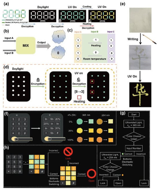 (a) Schematic of dual encryption–decryption using the “8888” template; (b,c) optical logic-OR gate based on 1:0.5% Sb3+ and 2:1% Sb3+; (d) experimental design of the light-controlled logic gate; (e) fluorescent ink application of 1:0.5% Sb3+. (f–h) Dynamic color-code keypad using B-site Sb3+/In3+ alloying []. Reprinted with permission from Ref. []. Copyright 2024, Wiley. * stands for the encryption–decryption process.
