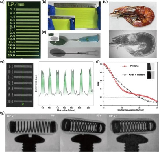 Flexible CDSCI scintillator films for X-ray imaging: (a) line-pair chart; (b) photographs at different stretch ratios; (c,d) X-ray images and photographs of an oil-filled capsule (top) and shrimp (bottom); (e) X-ray image and grayscale profile of the line-pair chart; (f) MTF via slanted-edge; (g) real-time dynamic imaging of a rotating spring capsule []. Reprinted with permission from Ref. []. Copyright 2024, Springer Nature.