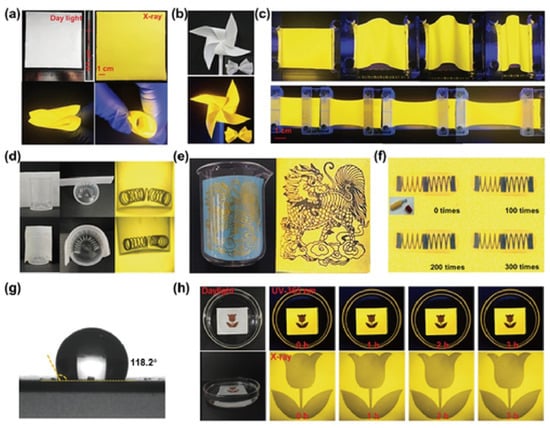 Curved-surface and underwater X-ray imaging using large-area ultraflexible C38H36P2Sb2Cl8 scintillator films []. Reprinted with permission from Ref. []. Copyright 2024, Wiley. (a) Scintillator screen under daylight, X-ray, folding, and curling. (b) Scintillator film patterned as a windmill and bow, under daylight and UV light. (c) Scintillator screen under UV light during bending and stretching. (d) X-ray images of a curved spring via planar vs. curved scintillator screens. (e) Angled X-ray imaging of a curved object. (f) Scintillator screen X-ray images after 0, 100, 200, and 300 stretching cycles at 150% strain. (g) Scintillator screen water contact angle. (h) Scintillator screen in water over time, under UV and X-ray..