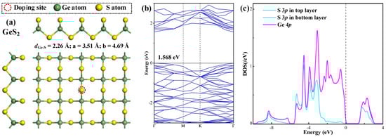 Geometric configuration (a), BS (b), and DOS (c) of the pristine GeS2 monolayer. In DOS, the dashed line is the Fermi level.