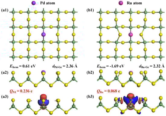 Optimized structures and CDD of (a1–a3) Pd-GeS2 monolayer and (b1–b3) Ru-GeS2 monolayer. In CDD, the electron accumulations are in blue while the electron depletions are in red, with the isosurface at 0.05 e/Å3.