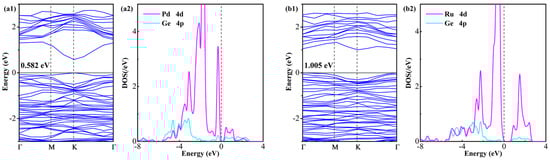 BS and DOS of (a1,a2) Pd-GeS2 monolayer and (b1,b2) Ru-GeS2 monolayer. The Fermi level in DOS is set to 0 eV.