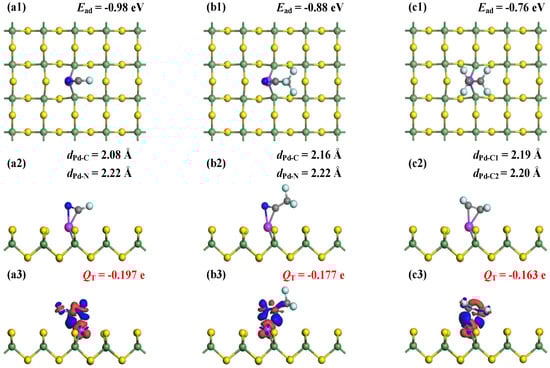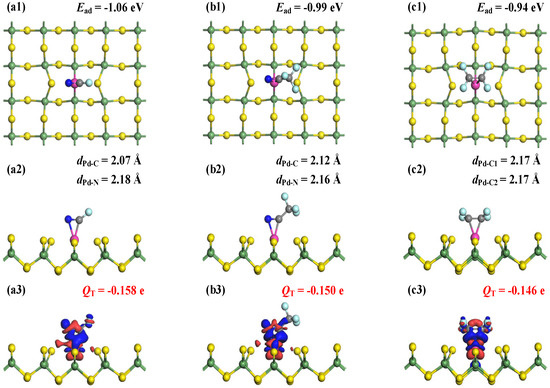 MSCs and CDDs of gas-adsorbed Pd-GeS2 systems. (a1–a3) FCN, (b1–b3) CF3CN, and (c1–c3) C2F4. in CDD; the sets are same as Figure 3.