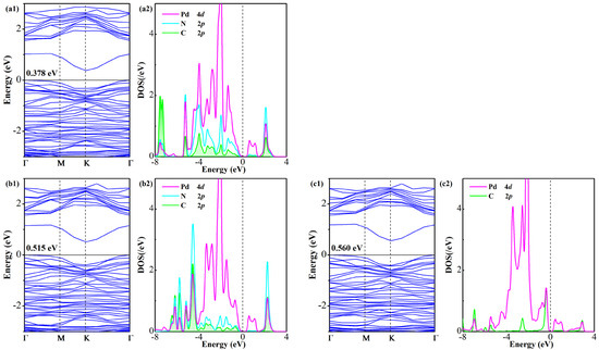 BS and DOS of Pd-GeS2/gas systems (a1,a2) FCN, (b1,b2) CF3CN, and (c1,c2) C2F4.