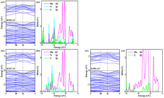 BS and DOS of Ru-GeS2/gas systems (a1,a2) FCN, (b1,b2) CF3CN, and (c1,c2) C2F4.