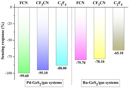 As illustrated in Figure 9, both Pd- and Ru-GeS2 monolayers exhibit negative SR values to the three C4F7N decomposed gases, though with different sensitivity characteristics. Specifically, the Pd-doped system shows more favorable response magnitudes, achieving SR values of −99.60% for FCN, −95.10% for CF3CN, and −88.00% for C2F4. In comparison, the Ru-doped monolayer demonstrates more moderate sensitivities, with corresponding responses of −79.70%, −78.10%, and −65.10%, respectively. This pronounced performance difference can be attributed to the more substantial bandgap reduction and enhanced charge transfer capability in Pd-doped systems, as evidenced by our previous electronic structure analyses. It should be noted that although both monolayers show limited selectivity upon different decomposed products, it does not diminish their practical utility for insulation-monitoring purposes. This is because in electrical equipment diagnostics, the primary aim is early detection of any decomposition gases as indicators of insulation degradation, rather than the precise identification of specific gas species [58].