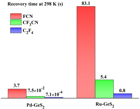 The computational recovery time of Pd- and Ru-GeS2 monolayers are exhibited in Figure 10, which uncovers their practical applicability for gas sensing in electrical insulation monitoring. As illustrated in this figure, the Pd-GeS2 system demonstrates outstanding desorption kinetics at ambient temperature (298 K), exhibiting recovery times of 3.7 s for FCN, 75 ms for CF3CN, and a remarkably fast 0.71 ms for C2F4. These time scales are particularly noteworthy as they fall well within the operational requirements for continuous monitoring systems in power equipment applications. While the Ru-GeS2 monolayer also shows acceptable recovery characteristics (83.1 s for FCN, 5.4 s for CF3CN, and 0.8 s for C2F4), its performance is notably slower compared to its Pd-GeS2 counterpart. In other words, the Pd-GeS2 monolayer is more suitable for gas sensor exploration in comparison with the Rh-doped counterpart.