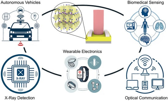 Pe-PDs potentially can offer broad application potential in areas such as X-ray detection [29], wearable electronics [30], autonomous vehicles [31], artificial intelligence [32], polarized imaging [33], optical communication [34], and biomedical sensing [35] (Figure 1). For instance, the strong X-ray absorption and efficient charge transport properties of perovskites make them well-suited for integration into high-resolution, low-cost medical imaging systems. In addition, Pe-PDs hold significant potential in biomedical applications [36], including non-invasive health monitoring using near-infrared light [37], as well as ultraviolet detection for flame monitoring [38], sterilization [39], and environmental sensing [40,41]. Their compatibility with imaging systems further enables advanced functionalities such as facial recognition and self-powered operation through integration with photovoltaic components. Furthermore, recent advancements in chiral Pe-PDs have facilitated the direct detection of circularly polarized light without the need for bulky external optical components [42,43]. Collectively, these innovations underscore the versatility and transformative potential of Pe-PDs, paving the way for their adoption in next-generation flexible and multifunctional optoelectronic devices.