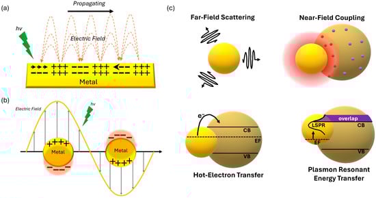 Schematics of the surface plasmons. (a) Propagating surface plasmon generated (SPP) at the metal-dielectric interface. (b) localized surface plasmon resonance (LSPR) induced in the metal nanoparticles. (c) Plasmon-driven far-field and near-field scattering, hot electron transfer (HET), and plasmon resonant energy transfer.