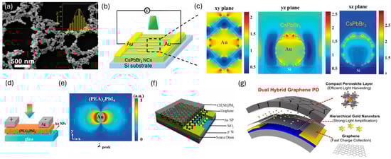 (a) SEM images comparing CsPbBr3 nanocrystal (NC) films fabricated by drop-coating. (b) Schematic demonstration of device configuration. (c) The simplified schematic structures of the simulation model [74]. Copyright © 2016 Wiley-VCH. (d) Scheme of the PD based on (PEA)2PbI4 SC. (e) Electric field distributions in the x–y plane at absorption peak wavelength of (PEA)2PbI4 SC with Au NPs (tAu = 5 nm) [75]. Copyright © 2023 Wiley-VCH GmbH. (f) Schematic of the device architecture used in this study [76]. Copyright © 2016 Royal Society of Chemistry. (g) Schematic of a graphene dual hybrid PD composed of a perovskite material and GNSs with illustration of the key role of each component in the synergistic effect for optical sensing [77]. Copyright © 2020 Springer Nature.