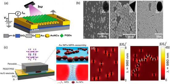 (a) The schematic illustration of PQDs/Au NCs/Gr hybrid electrostatic gate-free. (b) FE-SEM image of sphere, octahedral (OD), and rhombic dodecahedron (RD) Au NCs, respectively [78]. Copyright © 2023 Wiley-VCH GmbH. (c) The scheme of the perovskite/PEDOT–PSS photodetector comprising the Au NPs-MPA assembly embedded in the PEDOT–PSS layer. (d) The calculated electric field intensity distribution of plasmonic nanostructures at 980 nm [79]. Copyright © 2021 Elsevier B.V.