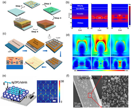 (a) Schematic of the fabrication methodology for the perovskite photodetector. (b) Absorbance density profiles of the control device, w/Au NR, and w/Au NR/PEIE Pe-PDs at λ = 680 nm, calculated from FDTD simulations [80]. Copyright © 2025 Elsevier Ltd. (c) Schematic of fabrication process. (d) Analyses of local electric field enhancement of Ag NP with different excitation wavelengths, and the influence of spacing distance under constant excitation wavelength [81]. Copyright © 2024 IEEE. (e) Ag/OPCs hybrid model for 3D FDTD simulation and simulated electric field intensity distribution of Ag/OPCs film at 410 nm (top view) [82]. Copyright © 2018 Wiley-VCH GmbH. (f) SEM image of a CsPbBr3 NW covered with physically isolated Ag NPs, along with an enlarged view of the Ag NPs [83]. Copyright © 2023 Royal Society of Chemistry.