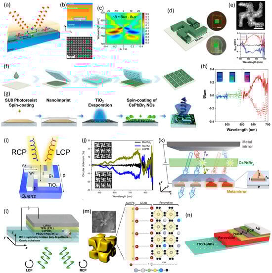 - Fiuza-Maneiro, N.; Mendoza-Carreño, J.; Gómez-Graña, S.; Alonso, M.I.; Polavarapu, L.; Mihi, A. Inducing Efficient and Multiwavelength Circularly Polarized Emission From Perovskite Nanocrystals Using Chiral Metasurfaces. Adv. Mater. 2024, 36, 2413967. [Google Scholar] [CrossRef]
