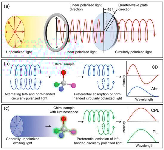 Fundamental properties of chiral OIMHs. (a) Relationship between unpolarized light, linearly polarized light and circularly polarized light. Schematic illustration of (b) CD and (c) CPL []. Reprinted with permission from Ref. []. Copyright 2019, Wiley.