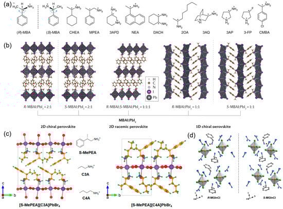 Recently, hybrid organic–inorganic metal halides (OIMHs)—including perovskite families across different dimensionalities—have drawn intense interest for optoelectronics owing to their strong optical absorption, efficient charge transport, long carrier diffusion lengths, and solution processability. Introducing enantiomerically pure organic molecules into the metal–halide lattice during crystallization enables low-cost, solution-grown chiral OIMHs. These materials exhibit pronounced chiroptical responses (circular dichroism, CPL) and spin-related phenomena such as strong spin–orbit coupling, Rashba splitting, and extended spin lifetimes, making them promising for spintronic applications. Billing and co-workers reported the first low-dimensional chiral OIMHs in 2003, followed by systematic structural analyses in 2006 and 2013 [,,]; in 2017, thin-film chiral OIMHs were comprehensively characterized for their chiroptical responses, marking a key milestone. Notably, even achiral organic cations can induce symmetry breaking through stereoselective arrangements of inorganic octahedra, yielding helical, chain-like architectures. Such structural engineering allows precise modulation of optical and electronic properties via rational selection of the chiral component (Figure 1).