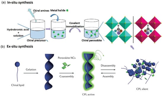 Recently, ex situ strategies have expanded to post-synthetic ion exchange, layer-by-layer assembly, and chiral doping of perovskite films. Shilpa et al. used poly(lauryl methacrylate) (PLMA) as a matrix to encapsulate CsPbBr3 nanocrystals and fabricate CsPbBr3–PLMA films, enabling efficient chirality transfer from ligands to OIMHs []. Likewise, electrospun PVA nanofibers loaded with MAPbX3 nanocrystals produced long-axis alignment of HOMH nanocrystals along the fiber direction [].