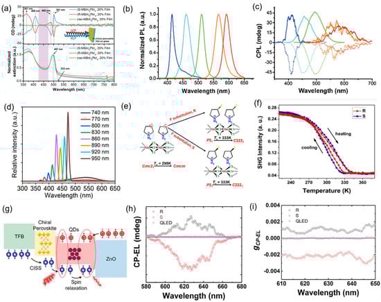 (a) Transmission CD spectra (up), and normalized extinction spectra of (S-MBA)2PbI4, (R-MBA)2PbI4, and (rac-MBA)2PbI4 films. (b) Fluorescence spectra of CsPbX3 NCs doped DGAm. and corresponding (c) mirror-image CPL spectra. (d) NLO spectra of a (R-MPEA)1.5PbBr3.5(DMSO)0.5 nanowire pumped at various wavelengths. (e) Design of Molecular Ferroelectrics through H/F Substitution. (f) Temperature-dependent second harmonic generation (SHG) response []. The schematic illustration of CP-EL emission in the spin-QLED (g), CP-EL degrees as a function of wavelength and related gCP-EL, (h,i) for the devices prepared with 0.05 m of chiral precursors []. Reprinted with permission from Ref. []. Copyright 2019, American Chemical Society. Reprinted with permission from Ref. []. Copyright 2023, Wiley.