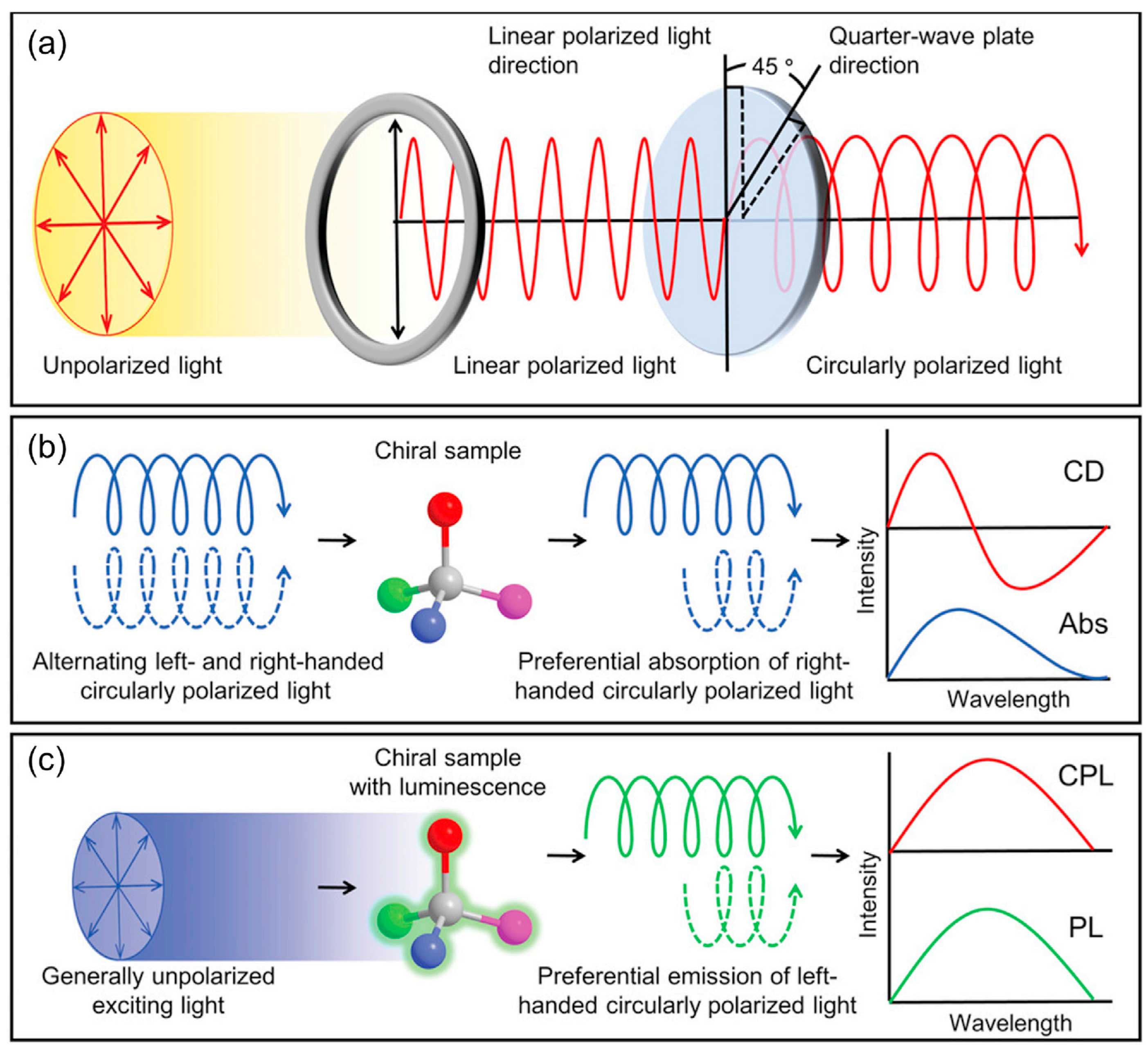Figure 1. Fundamental properties of chiral OIMHs. (a) Relationship between unpolarized light, linearly polarized light and circularly polarized light. Schematic illustration of (b) CD and (c) CPL [16]. Reprinted with permission from Ref. [16]. Copyright 2019, Wiley.