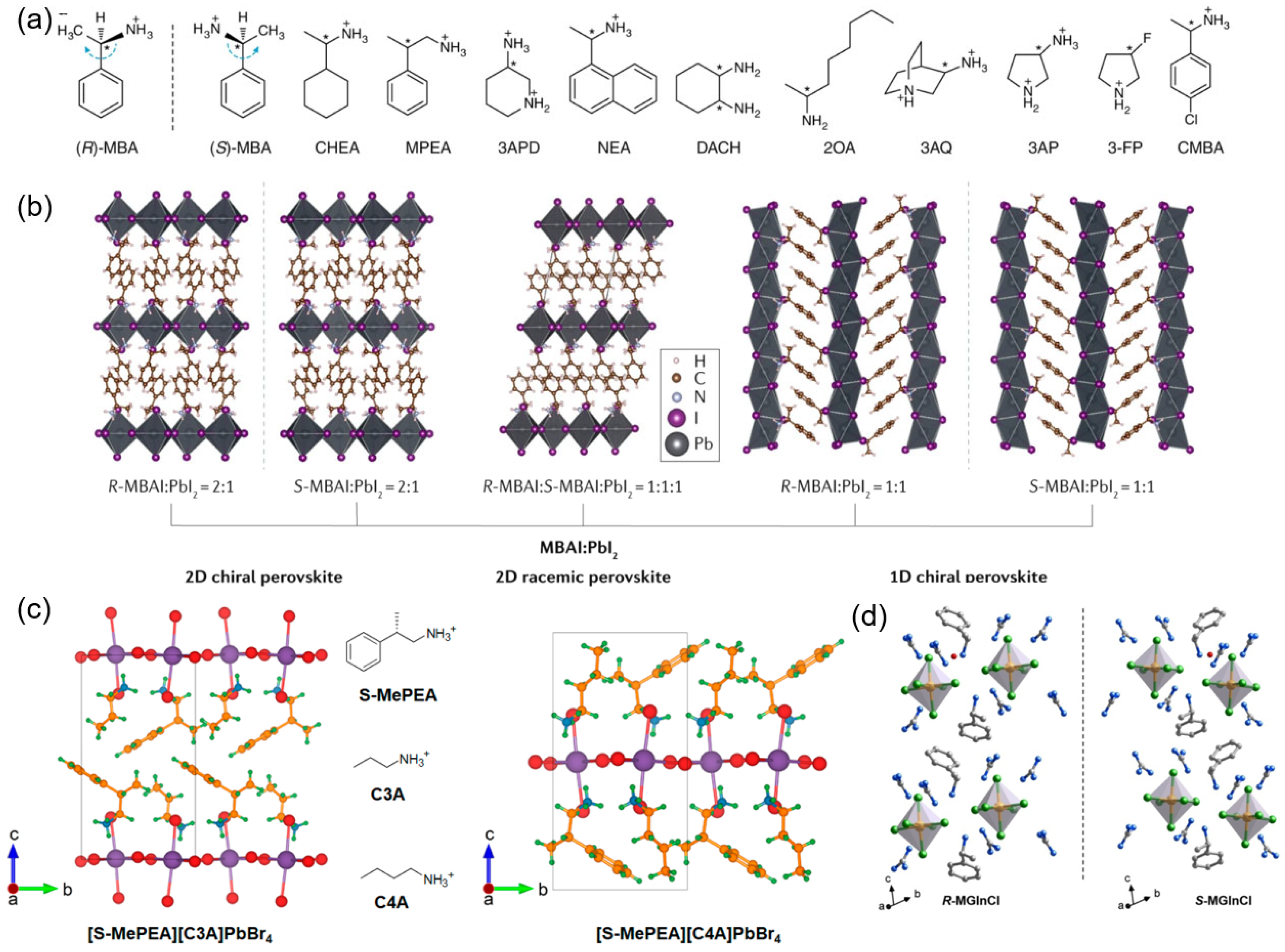 Figure 2. (a) Representative chiral ligands and chiral OIMHs. * stands for the chiral carbon atoms. (b) Single-crystal structures of 2D and 1D chiral OIMHs and of a 2D racemic achiral HOMH based on MBA:(R-MBA)2 PbI4, (S-MBA)2PbI4, R-MBAPbI3, S-MBAPbI3 and (rac-MBA)2 PbI4. (c) Schematic crystal structures of [S-MePEA][C3A]PbBr4 (left) and [S-MePEA][C4A]PbBr4 (right) viewed along the a axis [29]. (d) Schematic structures ofR-MGInCl (left) and S-MGInCl (right) single crystals [30]. Reprinted with permission from Ref. [29]. Copyright 2021, American Chemical Society. Reprinted with permission from Ref. [30]. Copyright 2023, Wiley.