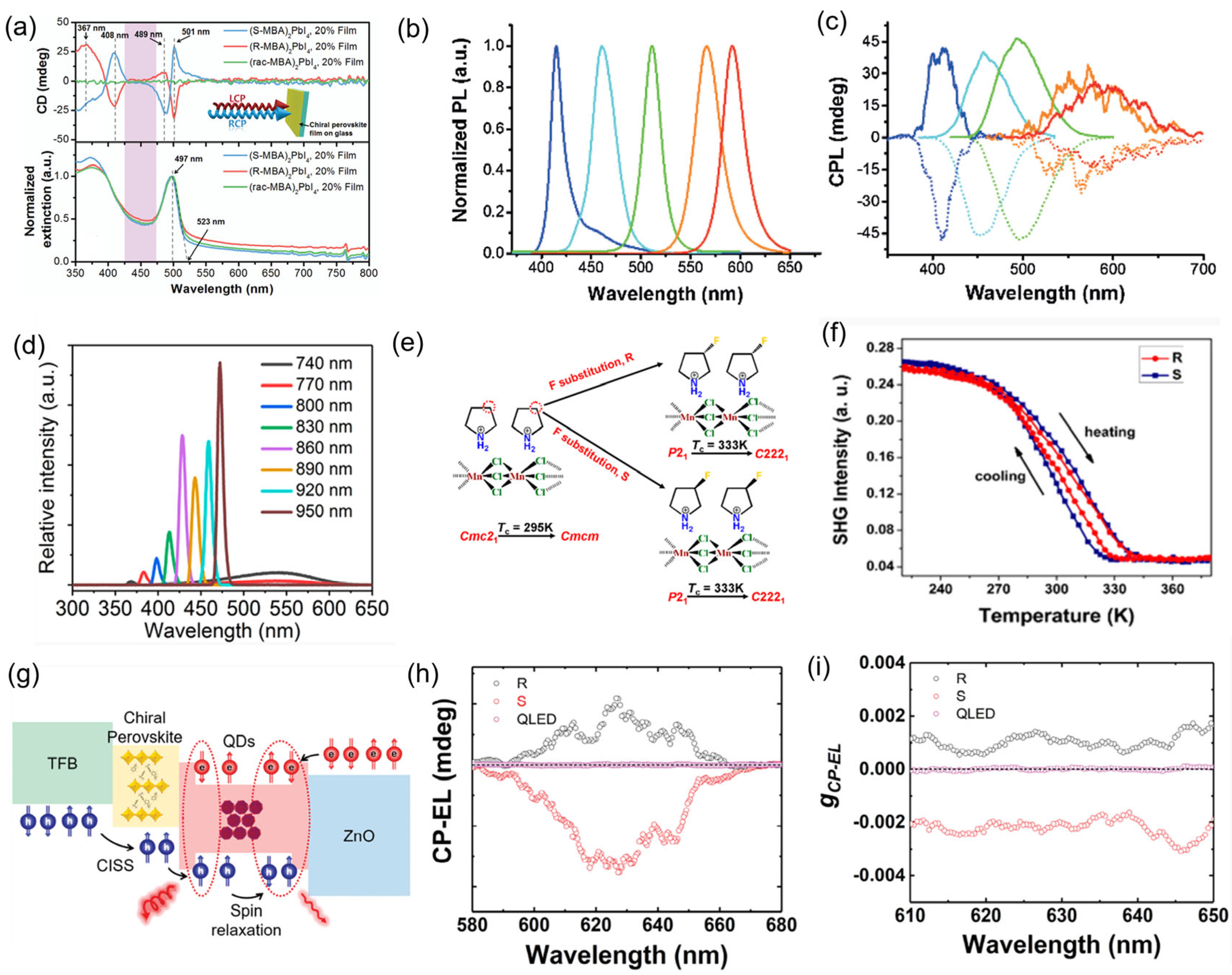 Figure 4. (a) Transmission CD spectra (up), and normalized extinction spectra of (S-MBA)2PbI4, (R-MBA)2PbI4, and (rac-MBA)2PbI4 films. (b) Fluorescence spectra of CsPbX3 NCs doped DGAm. and corresponding (c) mirror-image CPL spectra. (d) NLO spectra of a (R-MPEA)1.5PbBr3.5(DMSO)0.5 nanowire pumped at various wavelengths. (e) Design of Molecular Ferroelectrics through H/F Substitution. (f) Temperature-dependent second harmonic generation (SHG) response [28]. The schematic illustration of CP-EL emission in the spin-QLED (g), CP-EL degrees as a function of wavelength and related gCP-EL, (h,i) for the devices prepared with 0.05 m of chiral precursors [62]. Reprinted with permission from Ref. [28]. Copyright 2019, American Chemical Society. Reprinted with permission from Ref. [62]. Copyright 2023, Wiley.