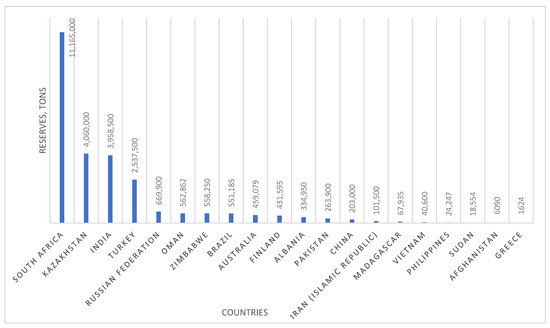 The largest chromite deposits are concentrated in South Africa, Kazakhstan, India, Turkey, and Russia, making these countries strategic players in the global ferrochrome and chromium products market [4,5,6,7]. South Africa alone accounts for over 70% of global chromium reserves, while Kazakhstan and Russia rank among the top five countries in terms of mining and processing volumes. This underscores not only the economic importance of the chromium industry but also its geopolitical role in ensuring resource security (Figure 1) [8].