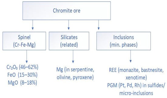 Magnesium in chromite ores is present as MgO within the spinel crystal lattice, where it partially substitutes for Fe2+ and Cr3+ through isomorphic replacement. In addition, Mg may also occur in silicate minerals such as serpentine, olivine, and pyroxene (Table 1, Figure 1). This complicates its recovery, since it requires either breaking the strong bonds within the spinel lattice or separating it from stable silicate phases [24].