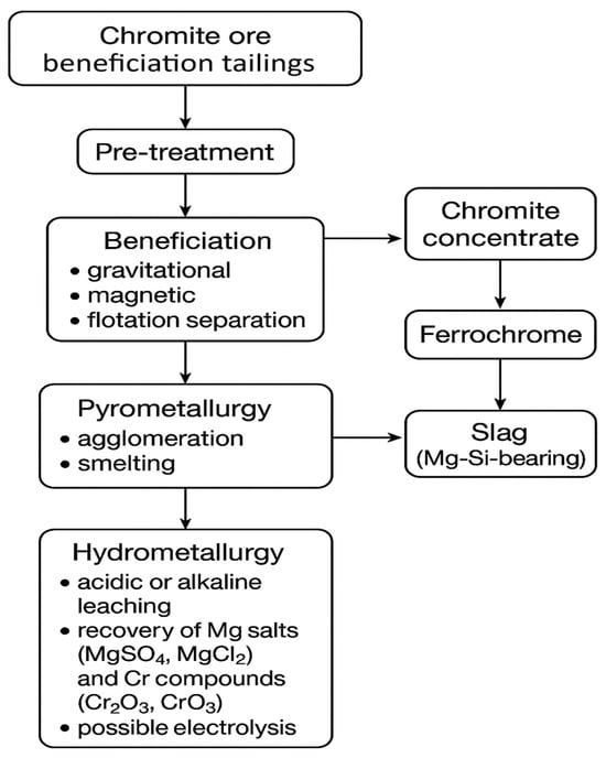 Research on serpentine wastes from the Zhitikara deposit [58] demonstrated the production of valuable magnesium compounds (MgSO4, Mg(OH)2, and MgO). Since serpentines are widespread silicate minerals commonly associated with chromite ores and concentrates, their processing enables the integrated use of ores and beneficiation tailings. The proposed technology is based on acid leaching with subsequent purification, yielding high-purity products. A techno-economic analysis confirmed its resource and energy efficiency, as well as the advantage of producing MgO as the end product.
