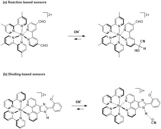 Two ruthenium(II)–polypyridyl complexes used as optical CN− sensors: (a) reaction-dependent strategy; (b) hydrogen bond strategy.