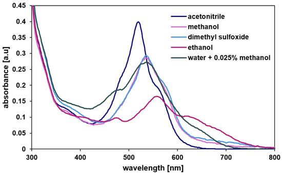 The molecular structure was characterized by 1H, 13C NMR, DOSY (Diffusion Ordered SpectroscopY), UV-vis (Figure 2) and mass spectrometry (Figures S1–S4). MRDPP is highly soluble in common organic solvents, including methanol, ethanol, dimethyl sulfoxide and acetonitrile. Like other compounds containing the DPP chromophore moiety [54], MRDPP exhibits an intense coloration with solvent-dependent UV-vis absorption bands in the range of 450 to 700 nm (Figure 2). This optical behavior originates from a combination of π → π* transitions, made possible by the extended π conjugation of the DPP core and metal–ligand charge transfer transitions (MLCT: dRu (II) → π*DPP) from the Ru(II) centers to the π-acceptor DPP unit [55]. The absorption spectra show pronounced solvatochromic effects, reflecting the high sensitivity of these electronic transitions to the dielectric constant and the polarity of the surrounding solvent. In polar protic solvents such as ethanol, methanol and water, an improved ligand-centered LUMO stabilization reduces the HOMO-LUMO energy gap, resulting in a bathochromic-shifted absorption band. On the other hand, aprotic polar solvents such as acetonitrile provide fewer hydrogen bond interactions, leading to a sharper and more defined absorption band centered at ≈540 nm. The chromophore shows high absorption in acetonitrile, with an extinction coefficient (ε) of 1.6 × 104 L·mol−1·cm−1 and low absorbance in ethanol (ε = 0.6 × 104 L·mol−1·cm−1), while in water the ε is 1.08 × 104 L·mol−1·cm−1, indicating moderate molar absorptivity.